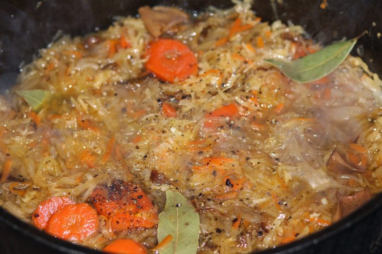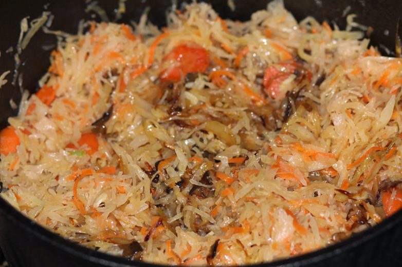 Кислая квашеная капуста нейтрализует жир и сама становится более нежной. Если нет утки, то можно использовать курицу или свинину. В качестве гарнира лучше всего подходит отварной картофель.
