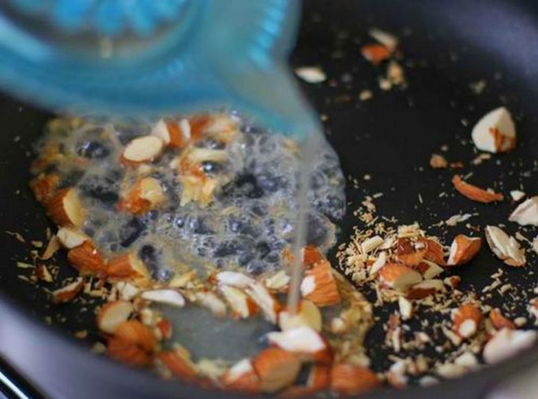 Горстку нечищенного миндаля рубим, поджариваем на сковородке, вливаем сок половины лимона и выключаем огонь.