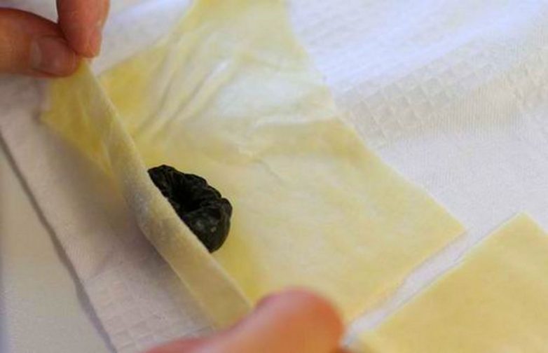 Для струделя его нужно выложить на посыпанное мукой полотенце, раскатать и растянуть руками. Нам большой кусок не нужен, поэтому на полотенце можно раскатывать небольшие кусочки. Если раскатать сразу все, тесто подсохнет. Такое тесто надо растягивать тонко-тонко, оно не рвется, а разделывать удобно ножницами. Растянутое тесто оставьте на минутку, а потом еще растяните, оно должно быть тонким, как бумага, а серединку можно оставить чуть потолще.