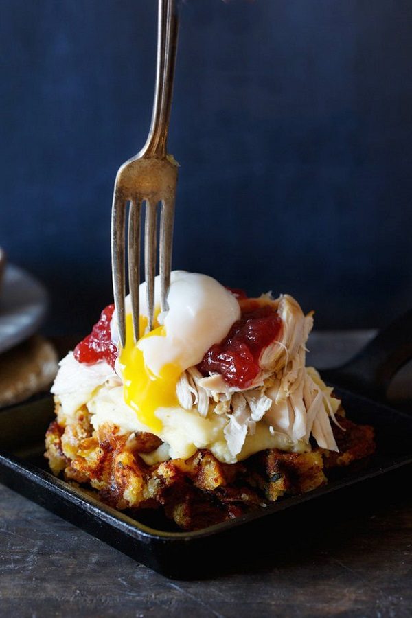 13. Обжарьте хлеб с чесноком и сделайте оригинальный бутерброд, состав которого может показаться странным: картофельное пюре, кусочки вареной курицы, клюквенный соус и яйца-пашот между кусочками хлеба. Очень интересный рецепт!
