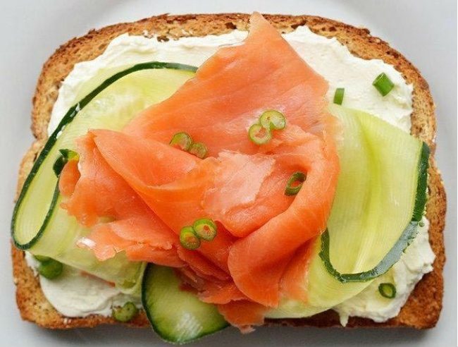 Копченый лосось, огурец, мягкий сыр, зеленый лук.