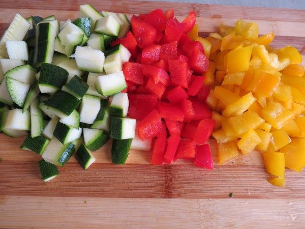 нарезать кубиками перец и цукину.
