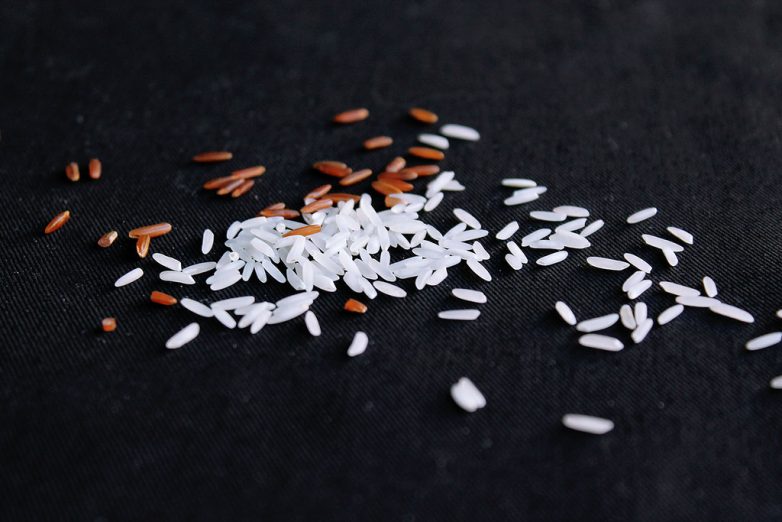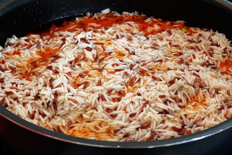 Все перемешал, сделал средний огонь и оставил тушиться еще минут 15. Теперь о рисе. Рис басмати — это длиннозерный рис. Готовится он быстрее обычного длиннозерного. Особенностью является, что он увеличивается в длину во время готовки. Красный же рис имеет специфический вкус. Это дикий рис. Готовить только из него — на любителя. А вот добавить в обычный рис для разнообразия можно.