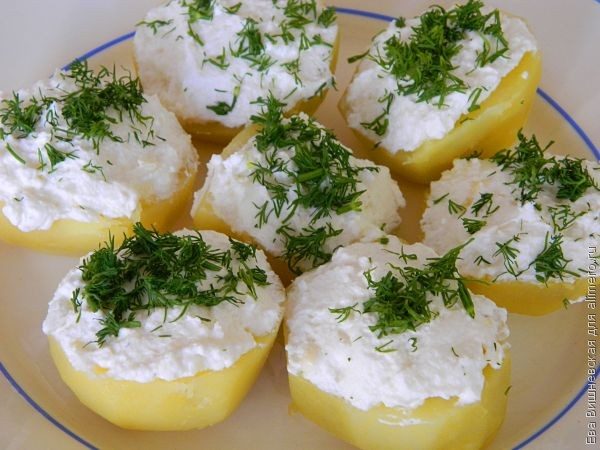 Это блюдо — картофель с творожным кремом — вполне может стать даже праздничным, если подать его с помидорками черри, маслинами или зеленым горошком.