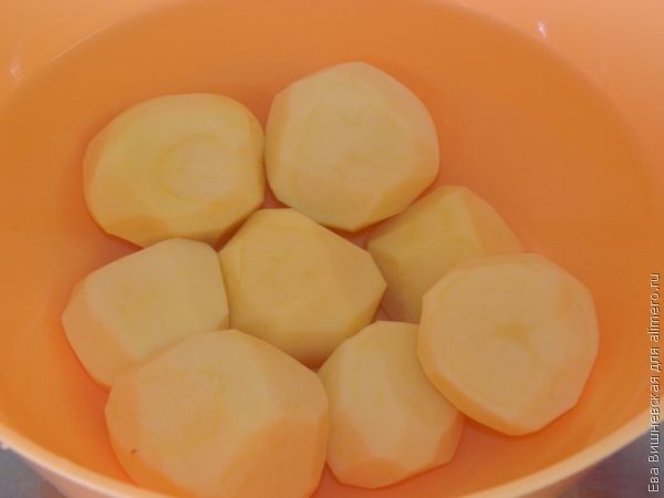 Картошку отбираем средненькую. Стараемся, чтобы вся она была примерно одного размера, тогда уже потом на блюде, в готовом виде, она будет выглядеть более достойно. Я выбрала почти одинаковую, но кое-где пришлось срезать то больше, то меньше, поэтому не могу в итоге похвастаться, что картошечка у меня одна к одной. Чистим ее, ставим варить до полной готовности в соленой воде. Если забудете посолить во время варки, эффект блюда будет сильно подпорчен.
