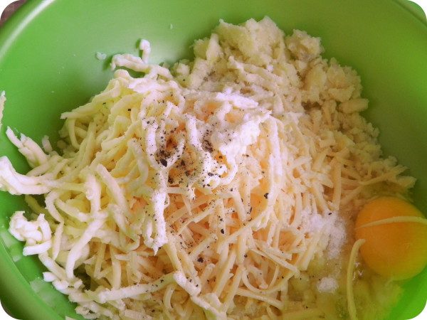 Картофель разомните, добавьте к нему тертый сыр, масло (на терке), яйцо, соль и перец. Вилкой как следует все смешайте.