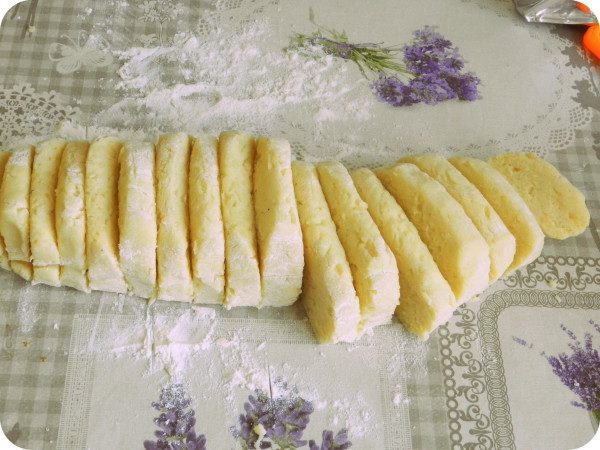 Добавьте муку, замесите тесто, скатайте из него колбаску. Разделите ее на равные части.