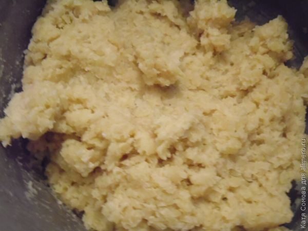 Когда картофель отварился, чистим его, трем на крупной терке. Добавляем к нему яйцо, крахмал и муку, солим, поперчим.
