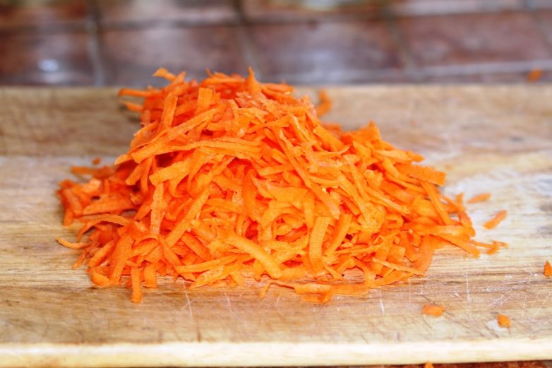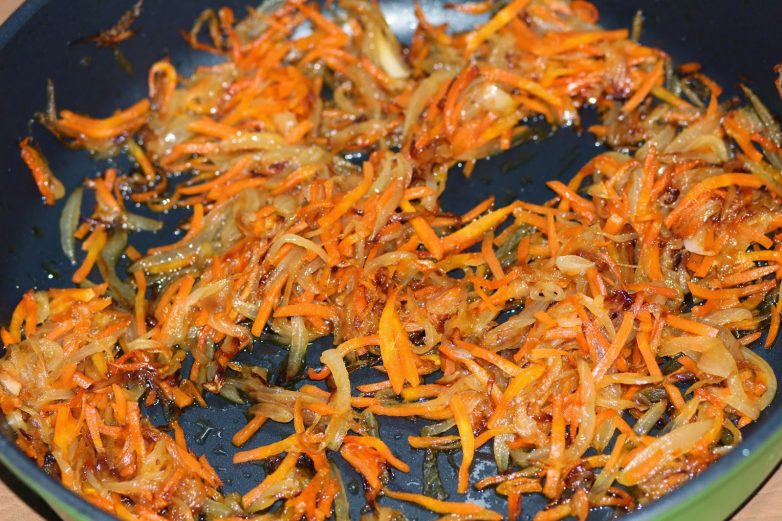 Добавить к луку морковку и обжаривать все вместе в течении 5 минут.