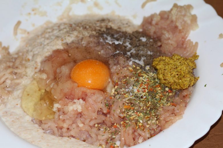 На мясорубке со средней решеткой прокрутить куриное филе, чеснок и хлеб. Добавить яйцо, горчицу, соль, перец черный молотый и приправу для курицы.
