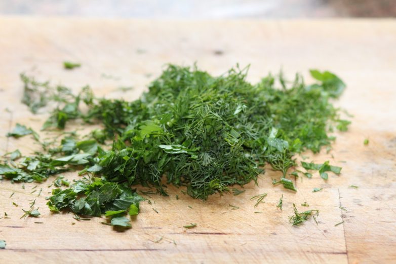 В миске смешать чеснок, лук с морковкой, укроп с петрушкой, перец острый соль и перец черный молотый.