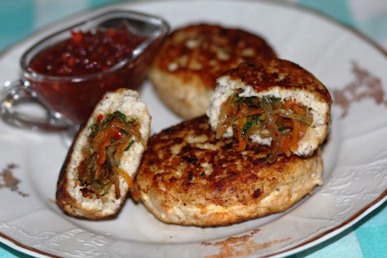 Очень сочные, пышные и невероятно вкусные зразы из куриного фарша! В качестве начинки можно так же использовать варёные яйца, грибы и даже каши.
