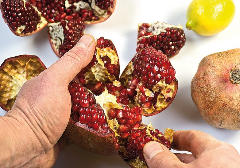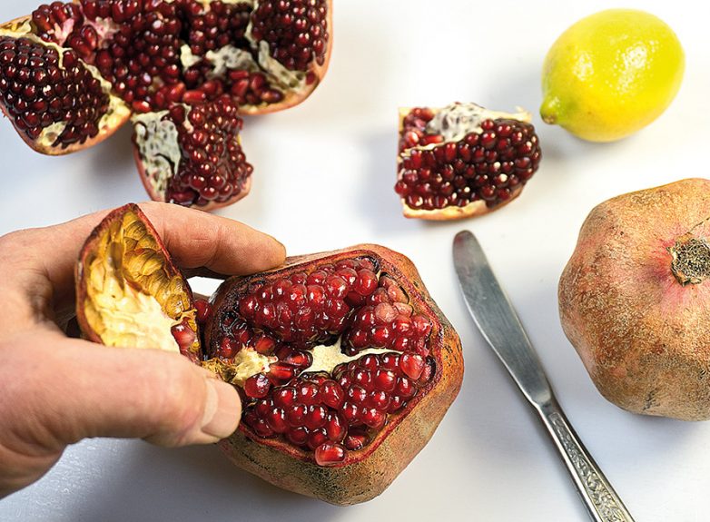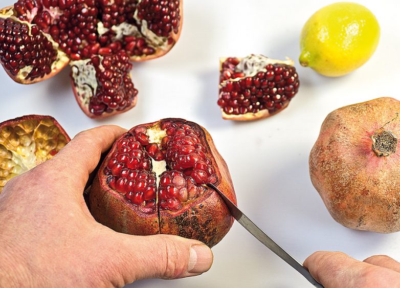 Останется только слегка потянуть надрезанные дольки граната в разные стороны, и они легко разойдутся, как лепестки кувшинки на заре — можно свободно вынимать зернышки граната, не травмируя их грубой силой или ножом.