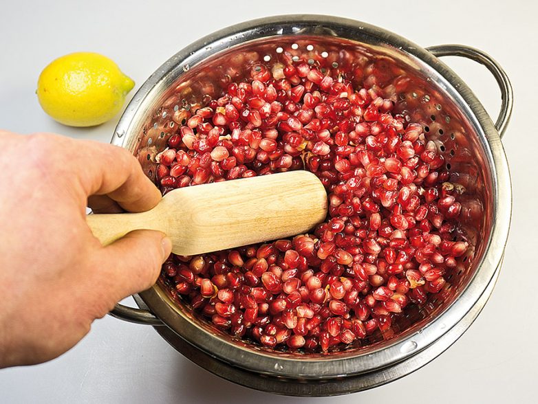 Теперь высвободившиеся зернышки нужно отжать любым доступным способом. Но так, чтобы сок был отдельно, а косточки отдельно. Я сделал это с помощью обыкновенной толокушки и дуршлага, под который подсунута миска.