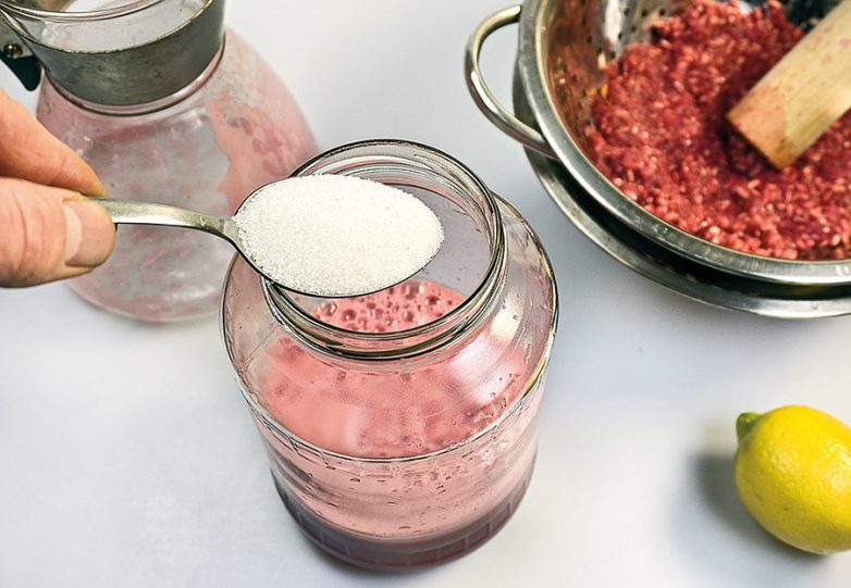 Теперь в сок можно добавить оговоренное количество сахара. Если при первых дегустациях наливки покажется, что сахара маловато, можно будет в последующем добавить ещё, поскольку это дело вкуса и правилам наливки, которых, напомню, нет как таковых, не противоречит.