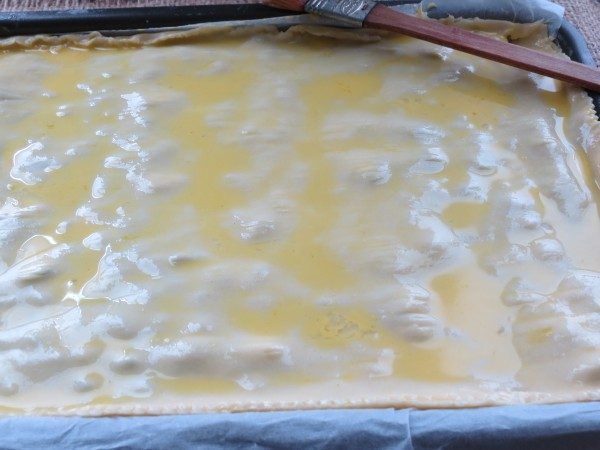 переложить на противень /36 на 26 см/, покрытый пергаментом, первый слой теста.