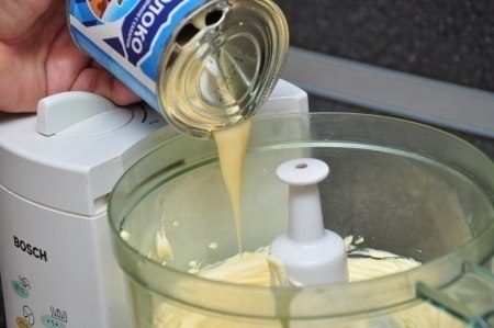 Сливочное масло комнатной температуры взбить в миксере, влить сгущенное молоко и ещё раз взбить. Добавить коньяк и взбить.