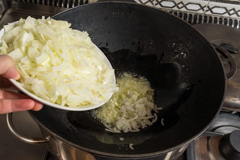 Для варианта без мяса необходимо взять больше лука и обжарить его чуть сильнее, может быть, даже до третьей степени.