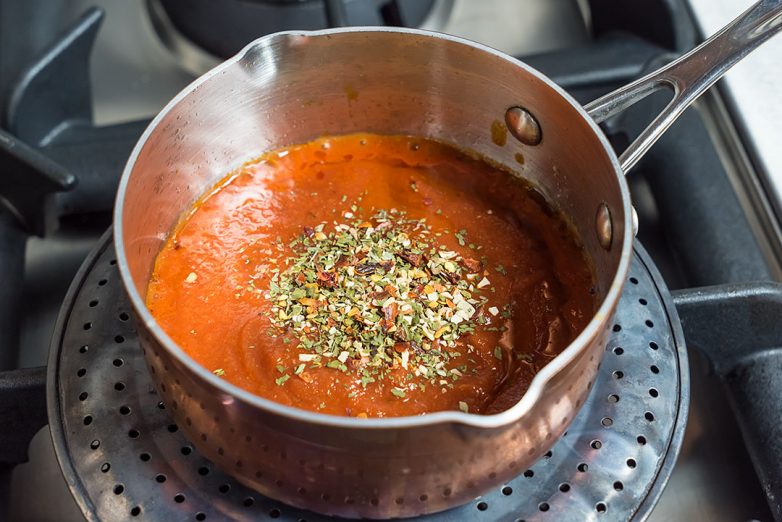 Можно, конечно, обжарить в масле ложку-другую томатной пасты, но лучше взять консервированные или хорошие, спелые свежие помидоры. Однако, как правило, такого рода каши готовят когда о свежих помидорах говорить уже не принято, поэтому сделайте свой выбор сами. Самое главное — добавьте щедрую ложку специй, в которых должен быть и молотый острый перец, и сухой чеснок и пряные травы. Например, подойдет почти любой набор для итальянской кухни. Не жалейте специй, потому что готовим мы не основное блюдо, а припаву, подливу — она должна быть намного ярче основного блюда!