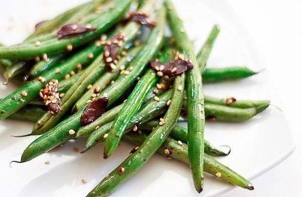 Возьмите полкилограмма зелёной фасоли, 2 чайной ложки оливкового масла и 1 чайную ложку кунжутного, чеснок, кунжут и соевый соус. Нагрейте большую кастрюлю или котелок на среднем огне. Налейте в него оливковое масло и добавьте нарезанный чеснок. Жарьте около минуты. Добавьте туда зеленую фасоль и кунжутное масло. Перемешайте и готовьте в течение 8-10 минут, пока фасоль не станет ярко-зеленой. Добавить соевый соус и часто помешивайте в течение 5 минут. Когда блюдо будет готово посыпьте его семенами кунжута.