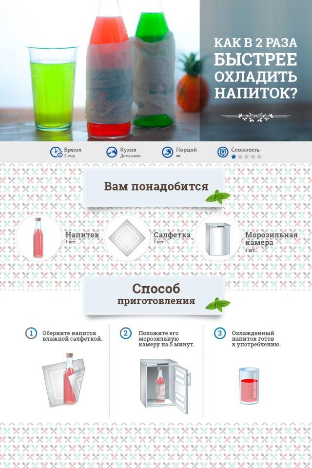 Охладить напиток быстро можно! Вам потребуется: Оберните напиток в салфетку и положите в морозилку на 5 минут. Так напиток охладится очень быстро!