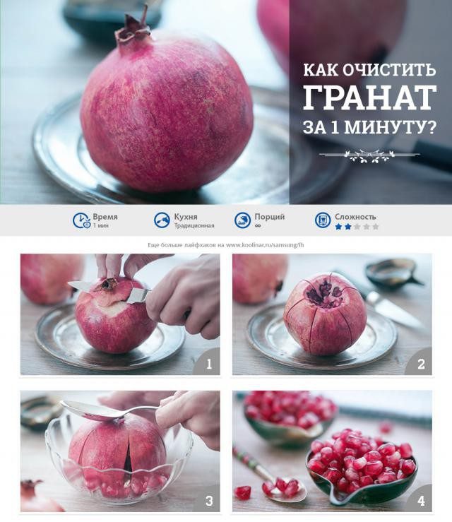 Очистить гранат можно легко и быстро с помощью несложных манипуляций. Вам потребуется: Срезаем верхушку граната, делаем надрезы вдоль прожилок. Затем переворачиваем плод и постукиваем по нему ложкой. Желательно, чтобы посуда была с высокими стенками, тогда вы не забрызгаете соком стол и не перепачкаетесь сами. Буквально через 1 минуту гранат будет очищен.