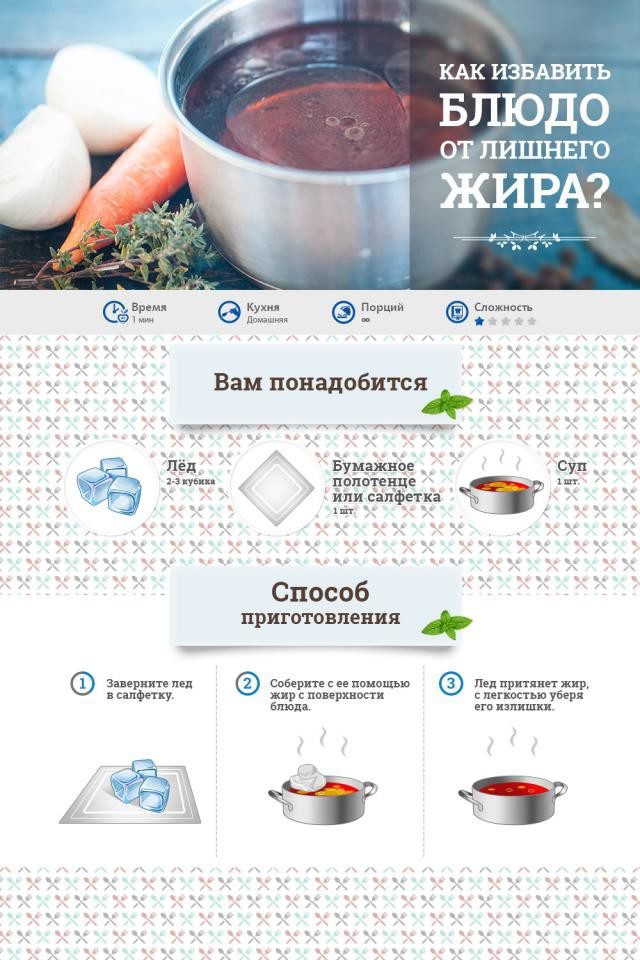 Слишком жирное блюдо можно «облегчить»! Вам потребуется: Заверните лед в салфетку. Соберите с ее помощью жир с поверхности блюда. Лед притягивает к себе жир как магнит, поэтому с легкостью уберет его излишки.