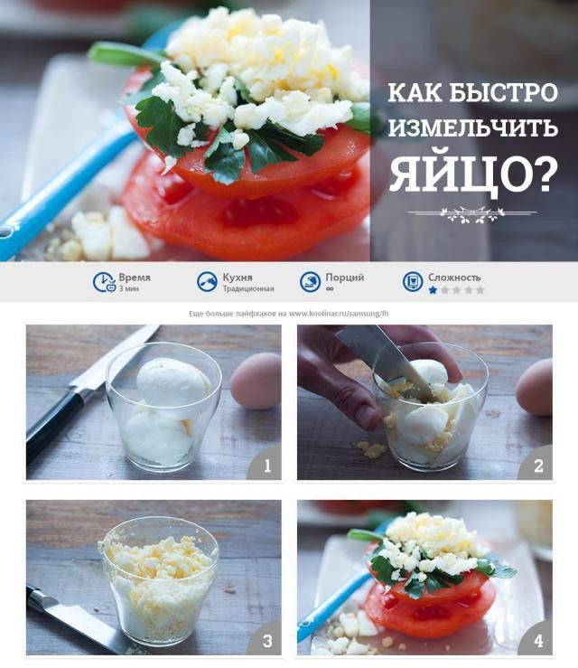 Вареные яйца для салата можно измельчить всего за минуту! Вам потребуется: Положите яйцо в стакан и просто порежьте его ножом прямо в стакане. Таким образом всего за минуту можно измельчить несколько яиц, не испачкав стол и руки.