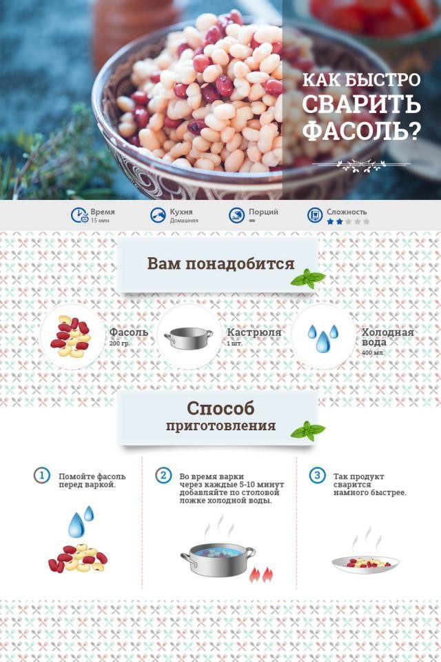 На варку фасоли уходит не так много времени! Вам потребуется: Во время варки фасоли или гороха через каждые 5-10 минут добавляйте по столовой ложке холодной воды. Так продукт сварится намного быстрее.