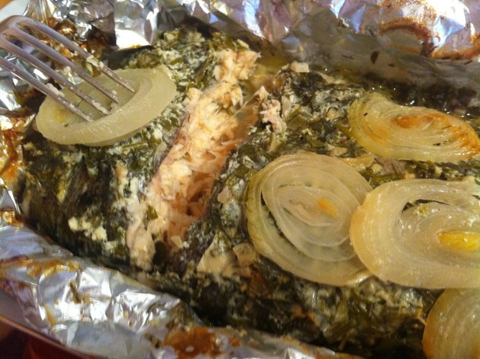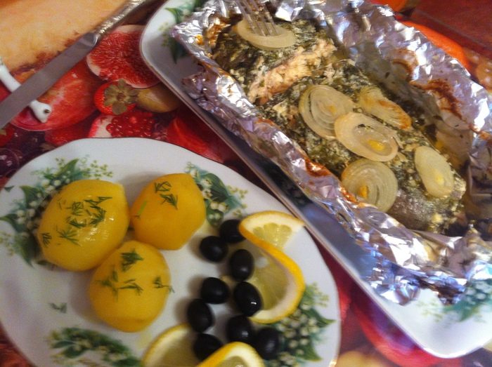 Через полчаса достаем рыбу и открываем фольгу. И обратно в духовку еще минут на 15-20, в зависимости от размеров рыбы.