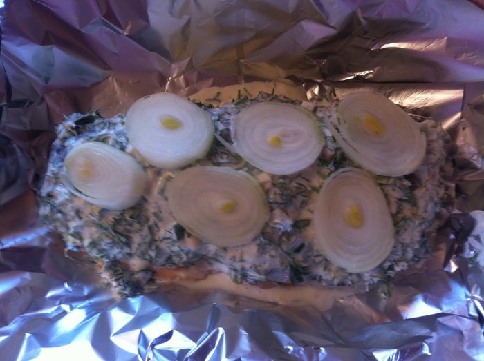 Уложить в фольгу. Сверху рыбы выложить кольца репчатого лука. Завернуть фольгу и поставить в разогретую духовку. Температура 180-200 градусов.