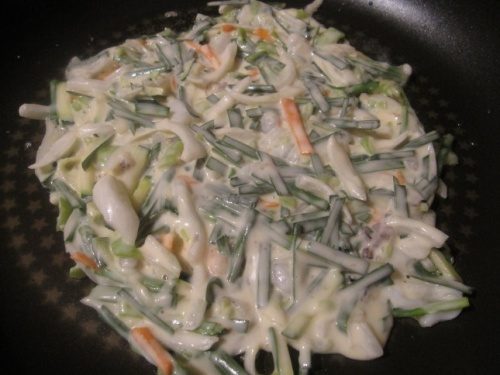 Корейские блины «Чон». Их обычно готовят с различными овощами, чаще с зеленым луком, при этом тесто выступает не как главное составляющее, а скорее как связующее.