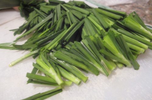 Далее промытый зеленый лук отряхиваем от лишней жидкости, перекладываем на разделочную доску и с шагом около 2 — 2,5 сантиметров нарезаем зелень. Зеленый лук убираем в тарелку к измельченным овощам.