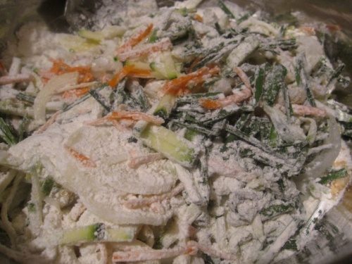 Снова перемешиваем и заливаем чистой водой. После этого сразу же премешиваем, чтобы вся мука и крахмал полностью растворились в воде. Наше тесто для корейских блинов готово и можно приступать к обжарке.