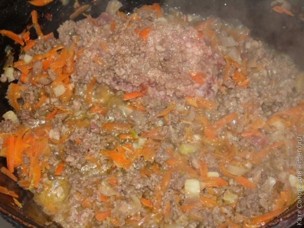 Добавляем фарш. Обжариваем его на большом огне, чтобы появилась золотистая корочка.