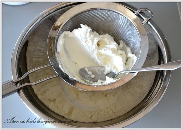 Я в миску поставила сито, сито застелила чистым кухонным полотенцем так, чтобы края свисали, выложила творожную массу, закрыла сверху свисающими концами, сверху положила миску с водой и всю эту конструкцию поставила в холодильник на 12ч.Лишняя жидкость за это время стекала в миску.