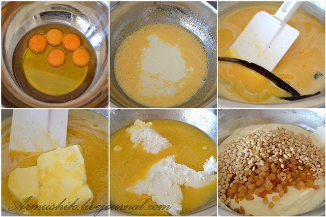 Взбить желтки с сахаром, добавить все ингредиенты: муку, масло, целое яйцо, дрожжевую массу, цедру лимона, изюм, тщательно перемешать лопатой или деревянной ложкой.
