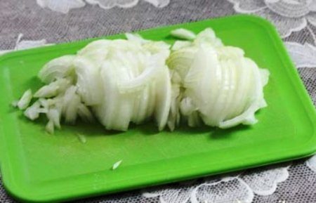 Капусту шинкуем, солим, мнем и выкладываем на лук.