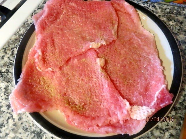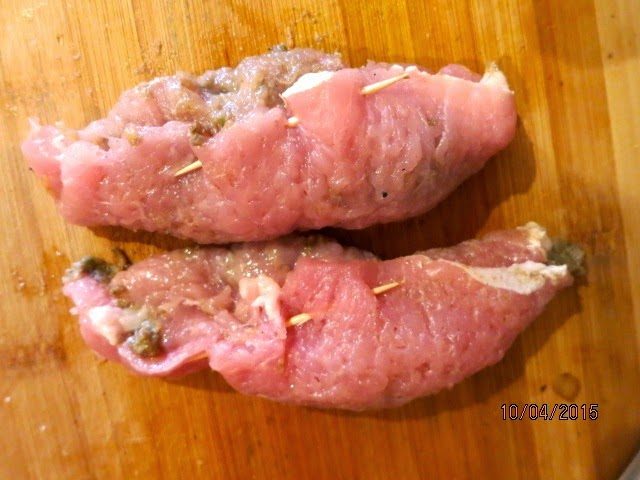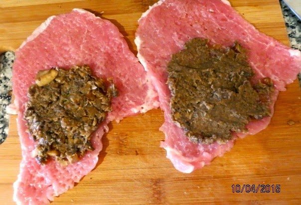 На каждую отбивную кладем пятую часть начинки ближе к узкому краю. Равномерно распределяем начинку по отбивной, оставляя широкий край свободным.