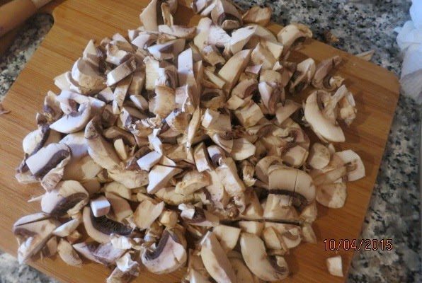 Добавляем на сковороду грибы и еще одну щепотку соли и готовим, часто помешивая, еще примерно 5 минут, до золотистого цвета грибов. Добавляем мелко нарубленный чеснок, перемешиваем и готовим еще 30 секунд. Перчим по вкусу, подсаливаем, если нужно, снимаем с огня и немного остужаем.
