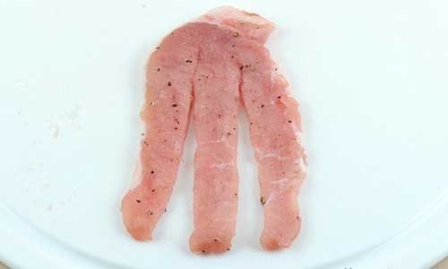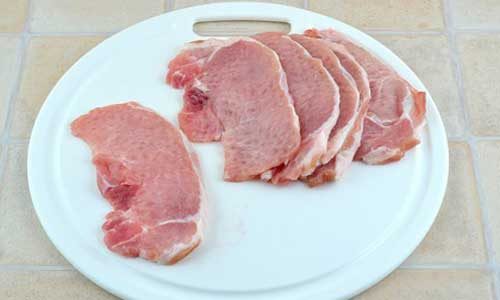 Далее займемся мясом, в данном блюде мы будем использовать свинину, но это не значит, что говядина не подойдет, можно использовать и ее. Мясо хорошо помоем и нарежем тонкими пластами как на отбивные, естественно эти самые пласты мяса нам необходимо отбить кулинарным молотком. Когда мясо отбитое, каждый пласт с обеих сторон посолим и поперчим.