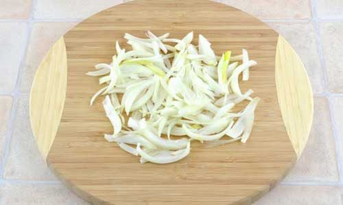 Какое же мясо без лука? Но сначала нам его необходимо подготовить, поэтому, берем наш лук, очистим от шелухи, слегка помоем и на кухонной досточке нарежем его полукольцами, так как мы резали, когда готовили свинину с ананасами.