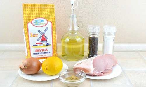 Теперь нам необходимо полученные косички замариновать, в глубокую миску помещаем мясные косички, лук, горчицу, выдавливаем сок с половинки лимона и все это хорошенько, но осторожно размешаем, в таком виде оставим мясо мариноваться на сорок — шестьдесят минут.