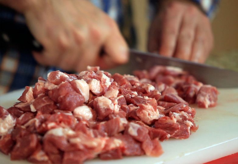 Отложив 800-900 г окорока, всё остальное мясо порезать довольно крупными кусками — со стороной 2-3 см.