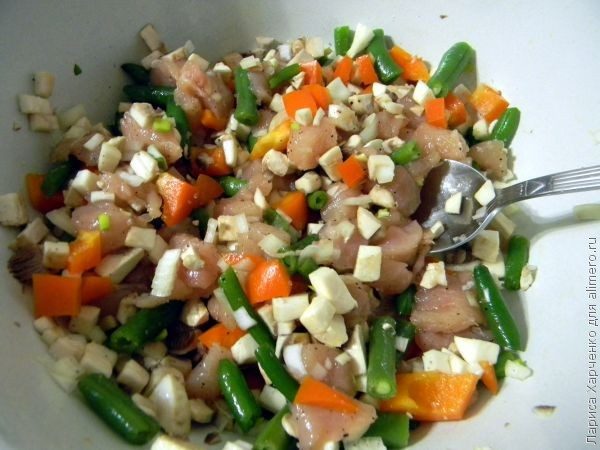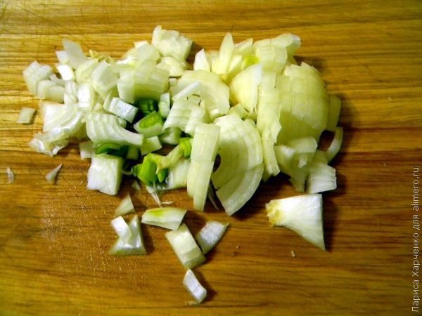 Грибочки, перчик и луковичку порежем кубиками средней величины.