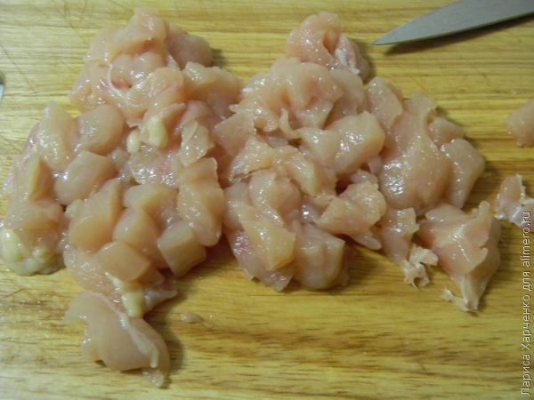 С куриного бедрышка обрезаем мякоть и тоже слегка измельчаем.