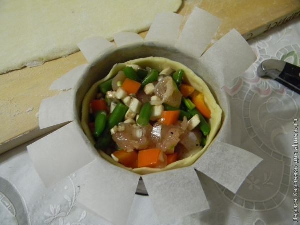 Теперь в форму выкладываем сначала донышко (бумагу и кружочек теста), а потом по кругу аккуратно прищипываем прямоугольник, вырезанный из теста (ну и бумаги, конечно).