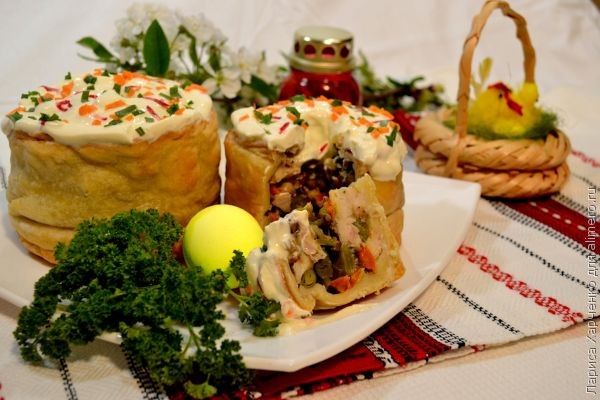 Оригинальный пасхальный рецепт, который никого из присутствующих за вашим праздничным столом не оставит безучастным – каждый заинтересуется и захочет попробовать… Речь идет о горячем, вкусном и сытном блюде из курицы и овощей, который мы с вами приготовим в форме… кулича!