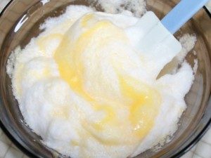 Желтки, масло и сахар растираем добела. Белки с щепоткой соли взбиваем в крепкую пену.