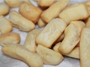 Масло разогреваем и полоски теста жарим во фритюре секунд по 20-30, пока не станут красивого цвета.